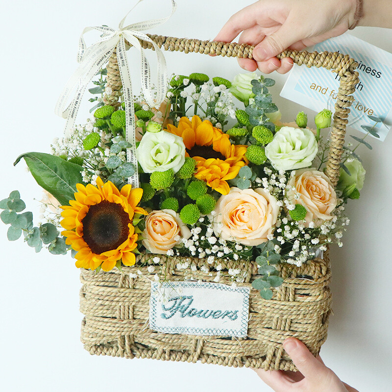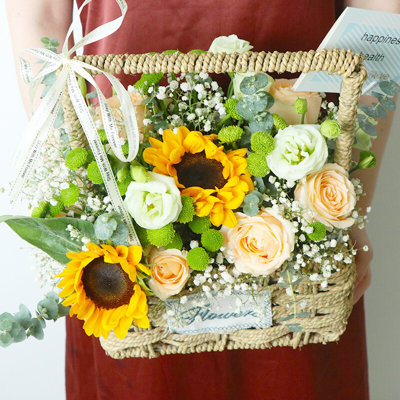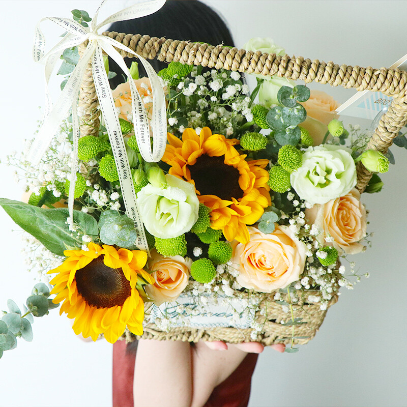 花材: 2支精品向日葵,5朵香槟玫瑰,3支白色洋桔梗(可用3支白玫瑰代替),搭配绿色小雏菊,白色满天星装饰,香槟色蝴蝶结点缀。