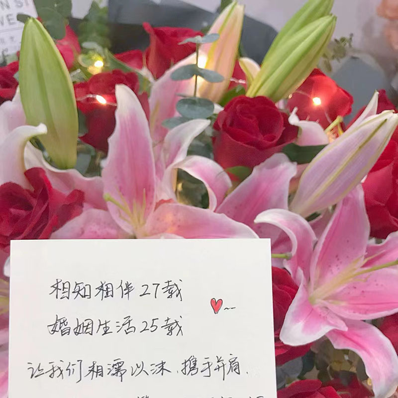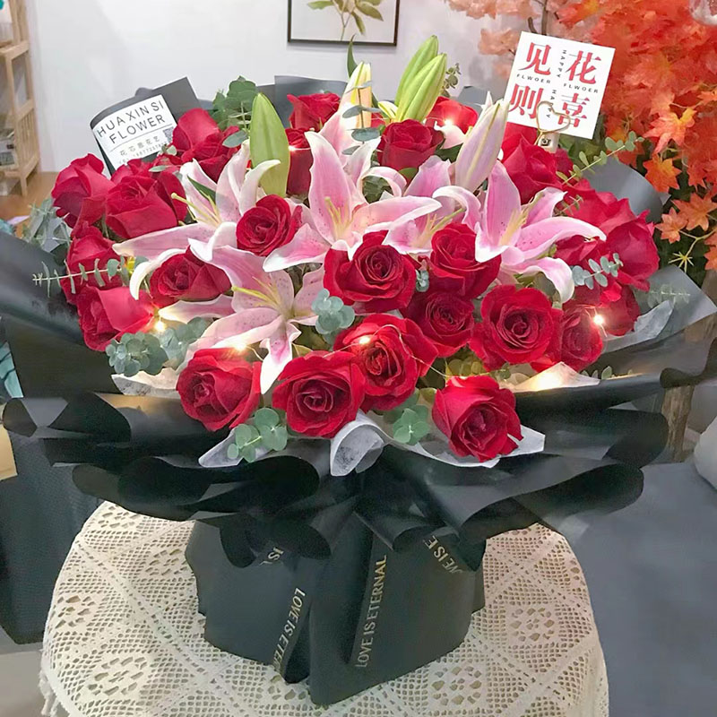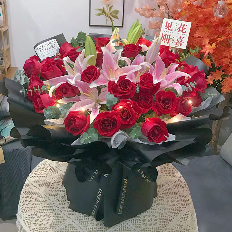 花材: 精选33朵红玫瑰,1条灯串,3支多头粉色香水百合,搭配尤加利叶间插。