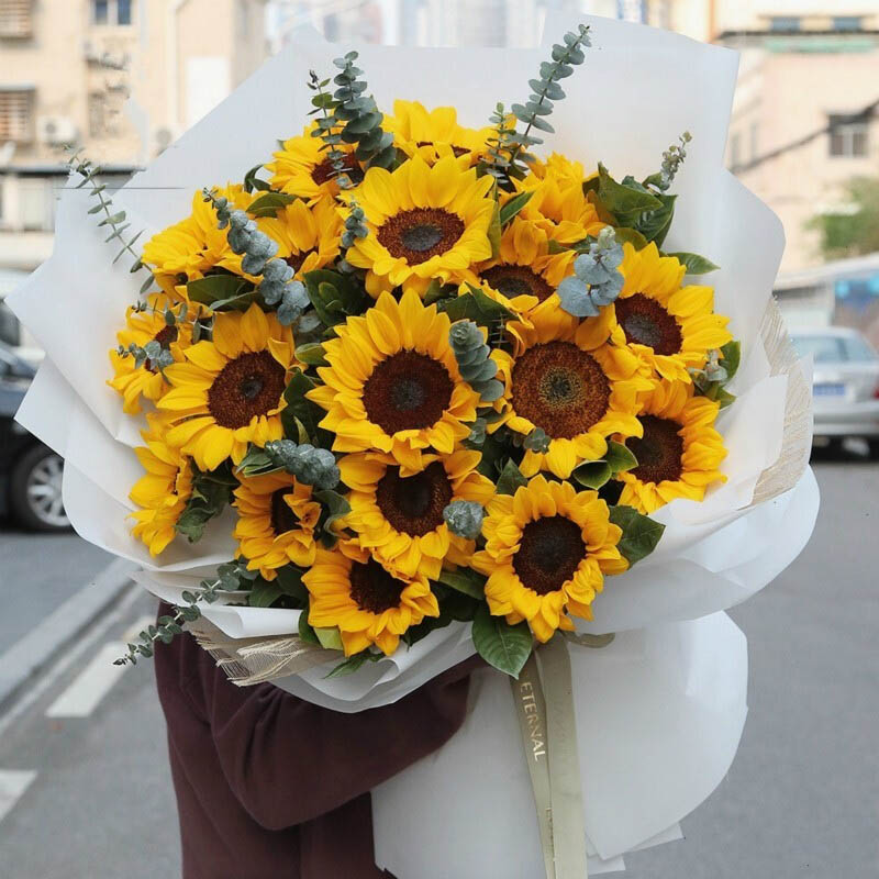 花材: 精选21朵向日葵,搭配尤加利叶装饰。