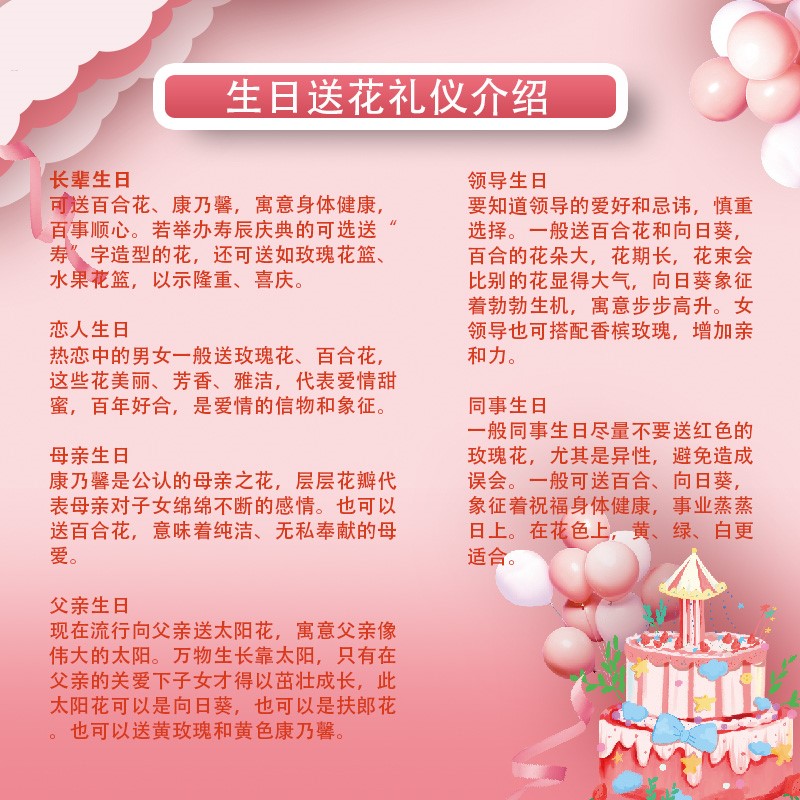 花材: 很多人喜欢用送花的方式来表达自身感情和愿望,尤其是在身边人生日时,一捧大大的鲜花带来的惊喜和关心,是一些礼物完全不能媲美的。