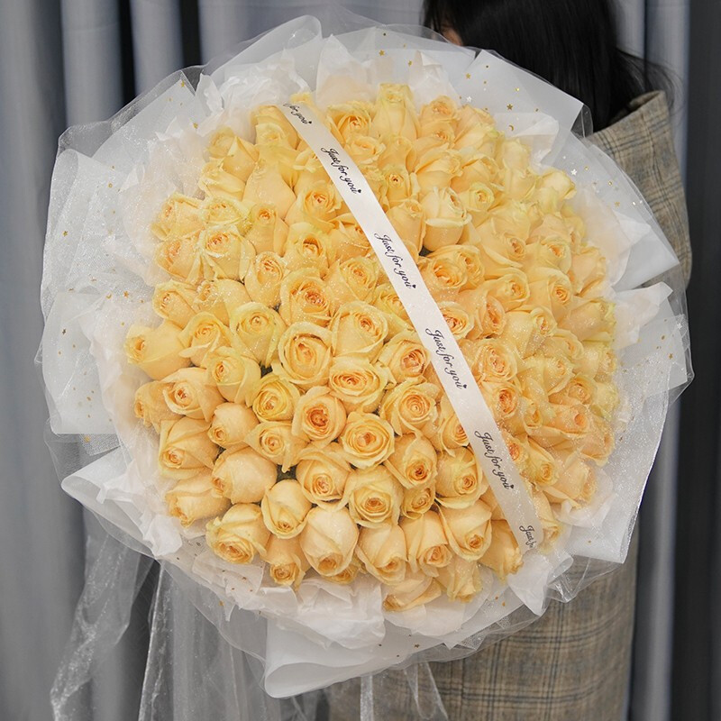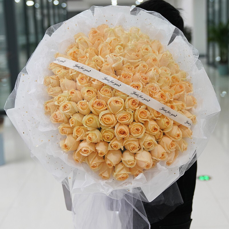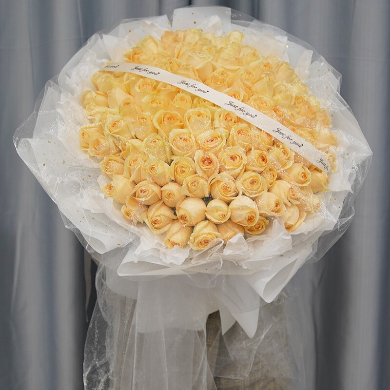 花材: 精选99朵顶级香槟玫瑰,花面用香槟色英文缎带装饰。