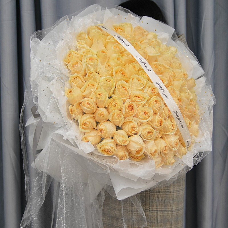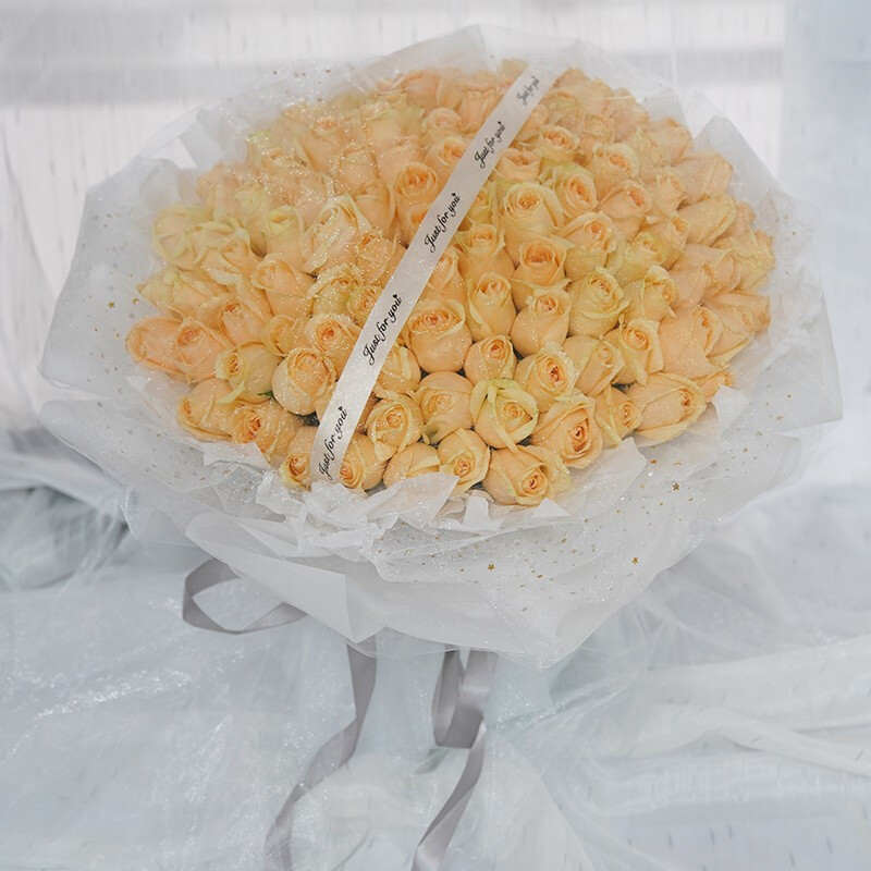 花 材:精选99朵顶级香槟玫瑰,花面用香槟色英文缎带装饰。