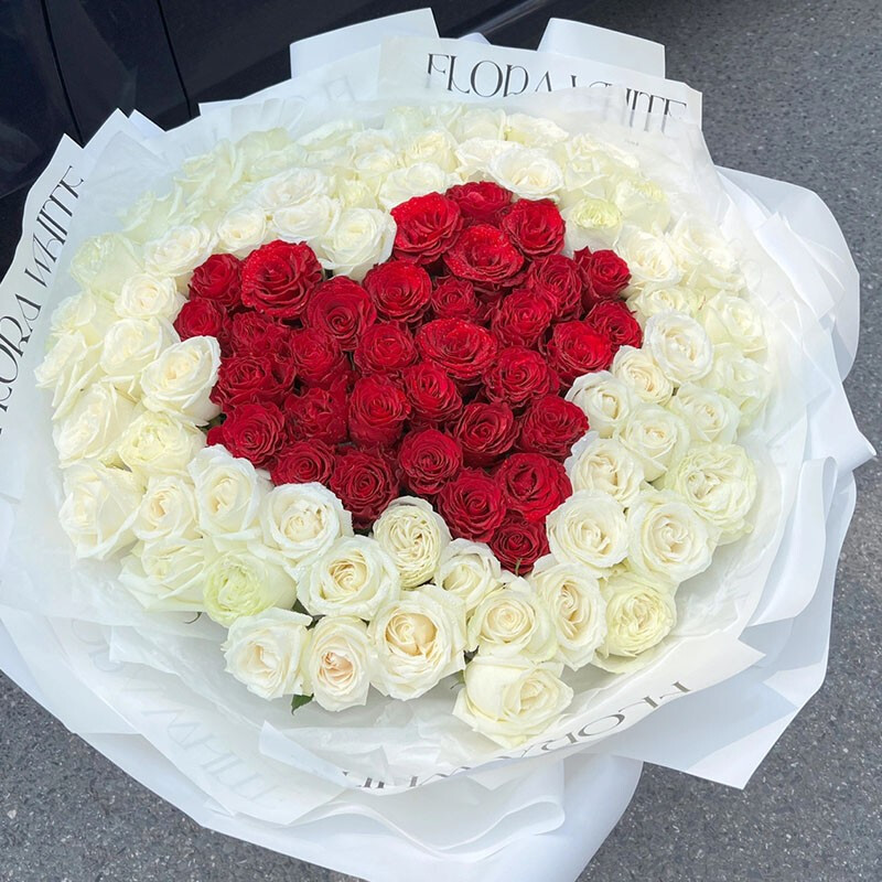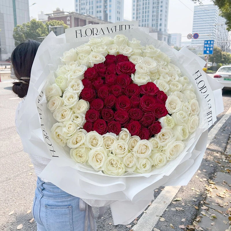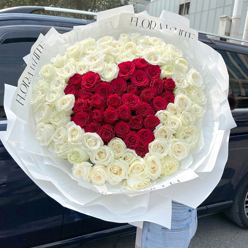 花材: 精选99朵玫瑰混搭:33朵红玫瑰心形造型,66朵白玫瑰外围环绕