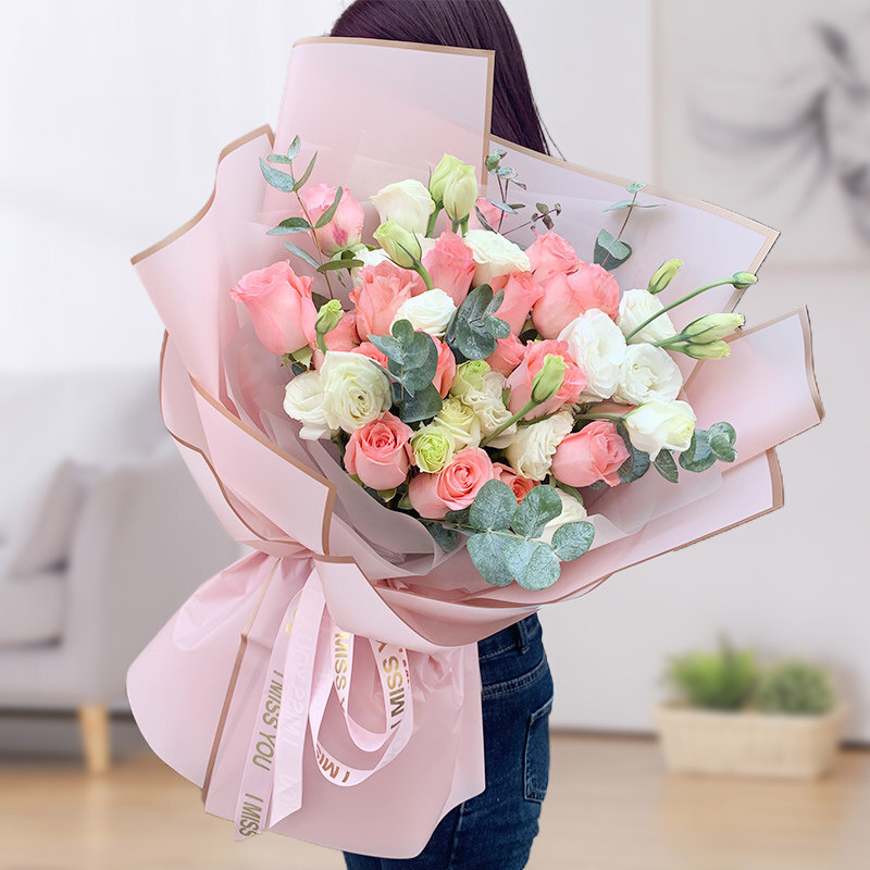 包 装:白色雾面纸内衬,粉色金边雾面纸多层外包,同色系英文花结。