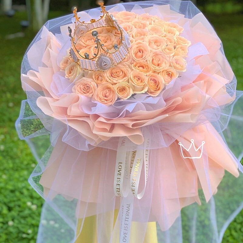 花材: 精选52朵香槟玫瑰,皇冠置于花面装饰。