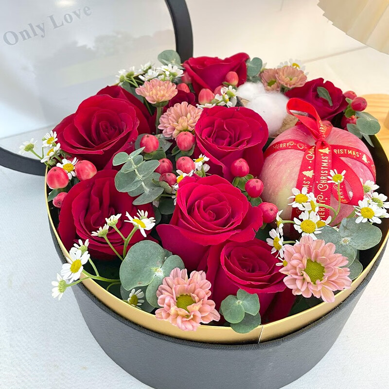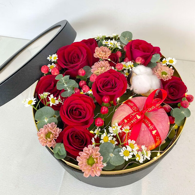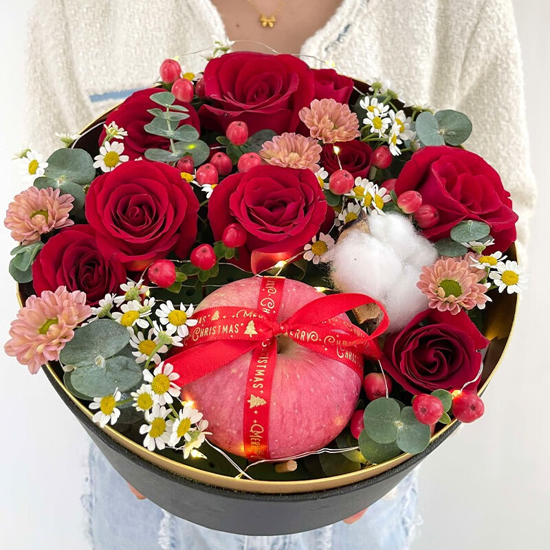 花 材:1颗苹果,8朵红玫瑰,1条彩灯,1朵棉花,搭配小雏菊,红豆,尤加利叶装饰。
