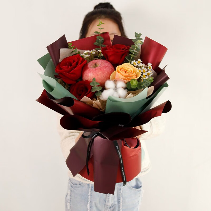 花 材: 1颗苹果,3朵红玫瑰,1朵香槟玫瑰,1颗棉花(可用白玫瑰代替),搭配小雏菊,尤加利叶装饰。