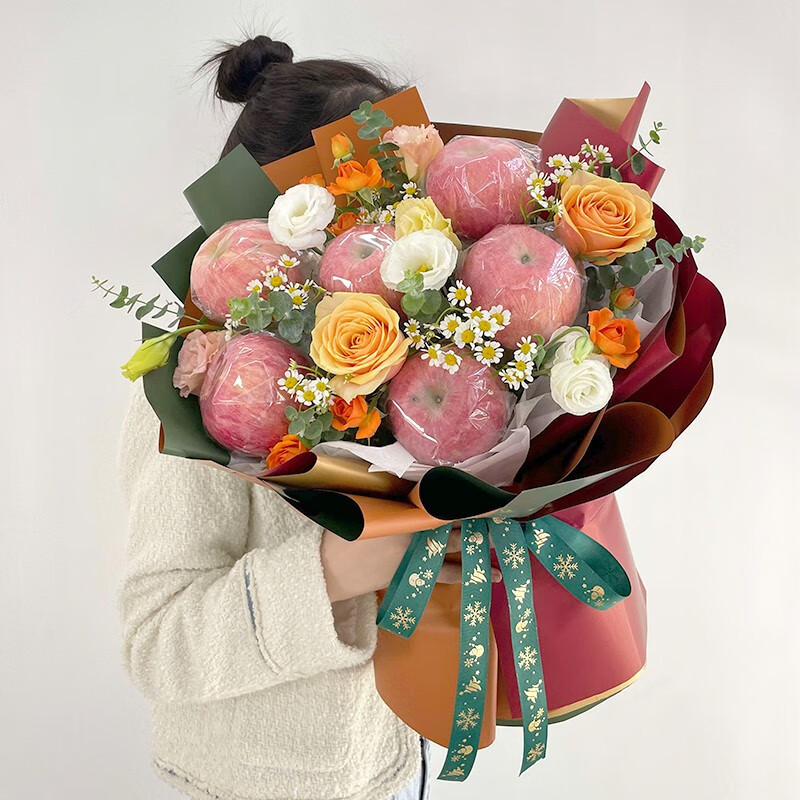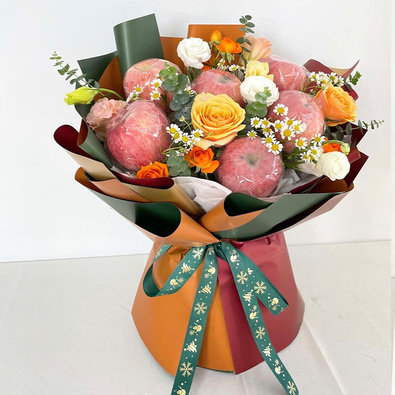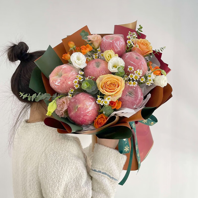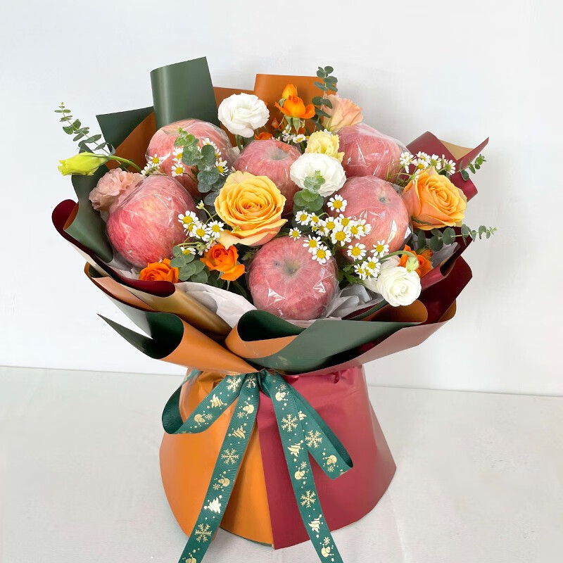 花材: 6颗苹果,2朵香槟玫瑰,3支多头橙色小玫瑰,4支洋桔梗,搭配小雏菊(或白色满天星),尤加利叶装饰。
