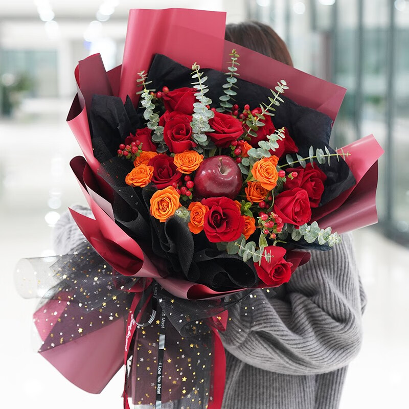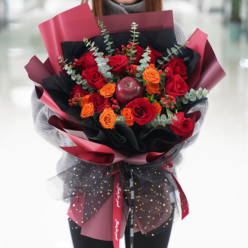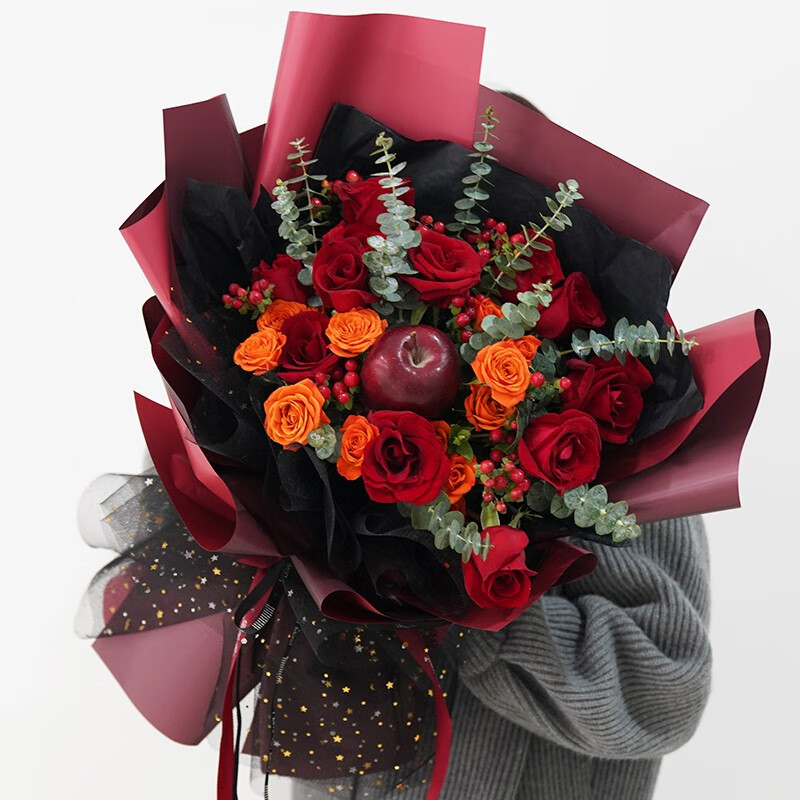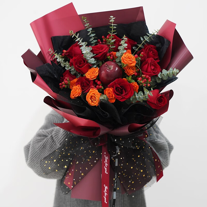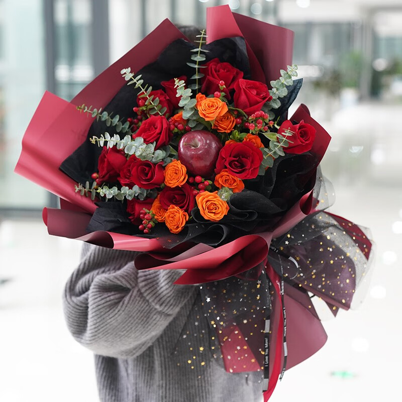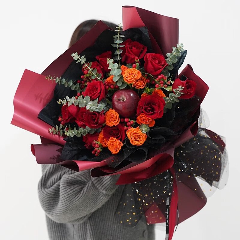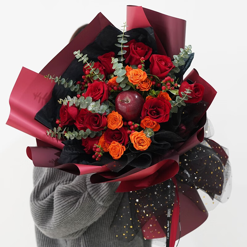 花 材:1颗苹果,11朵红玫瑰,8支多头橙色小玫瑰(断货则用8支香槟玫瑰代替),红豆,尤加利叶装饰。
