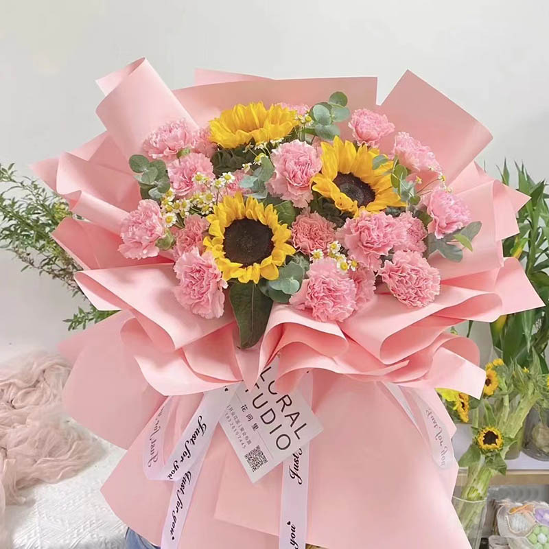花 材:19朵粉色康乃馨,3朵向日葵,搭配尤加利叶等配花装饰。