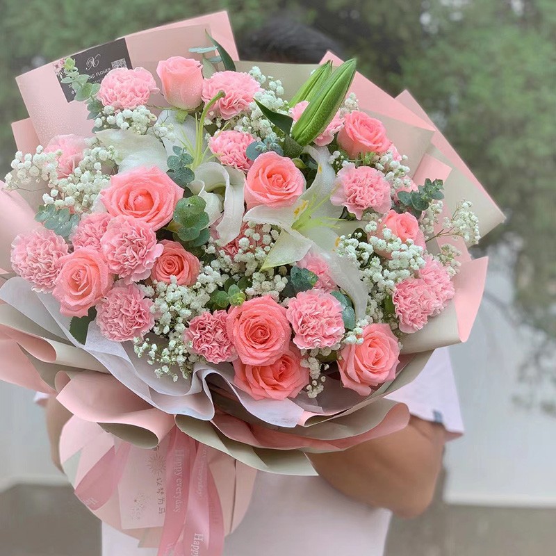 花材: 33朵粉色康乃馨、粉玫瑰混搭,2支多头白色香水百合,满天星,尤加利叶装饰。