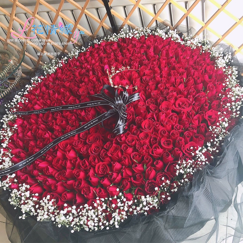 花 材:999朵红玫瑰,满天星环绕,花面皇冠、蝴蝶结装饰。