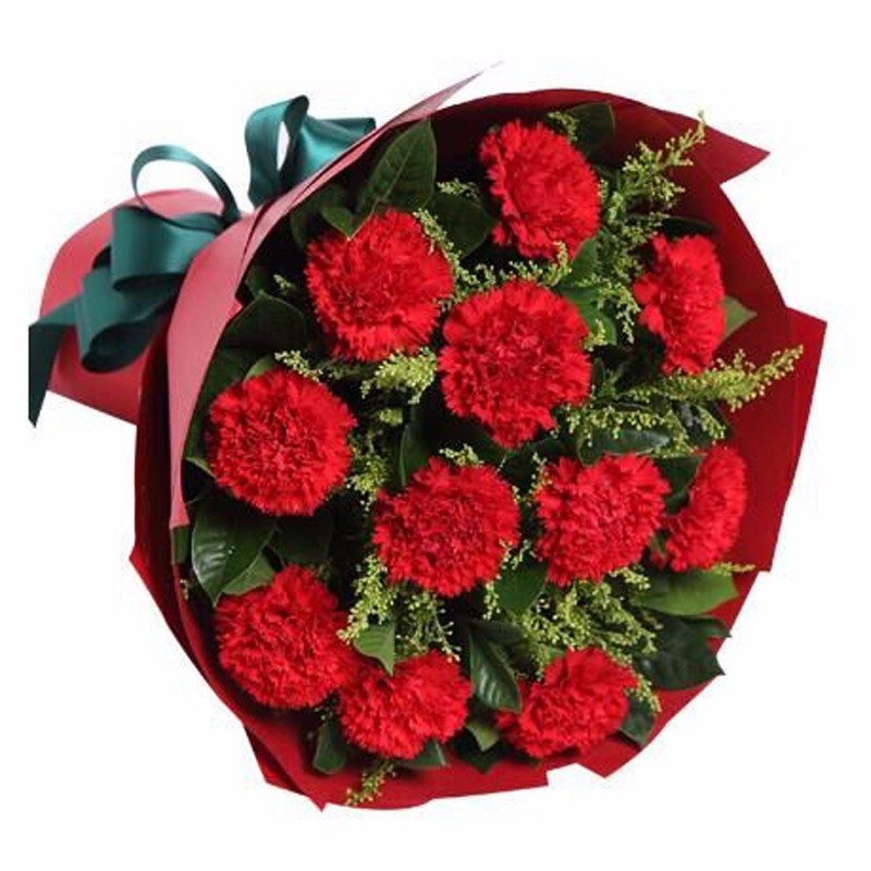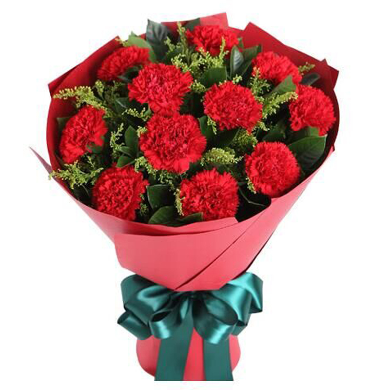 花材: 11支红色康乃馨,搭配适量栀子叶、黄莺。