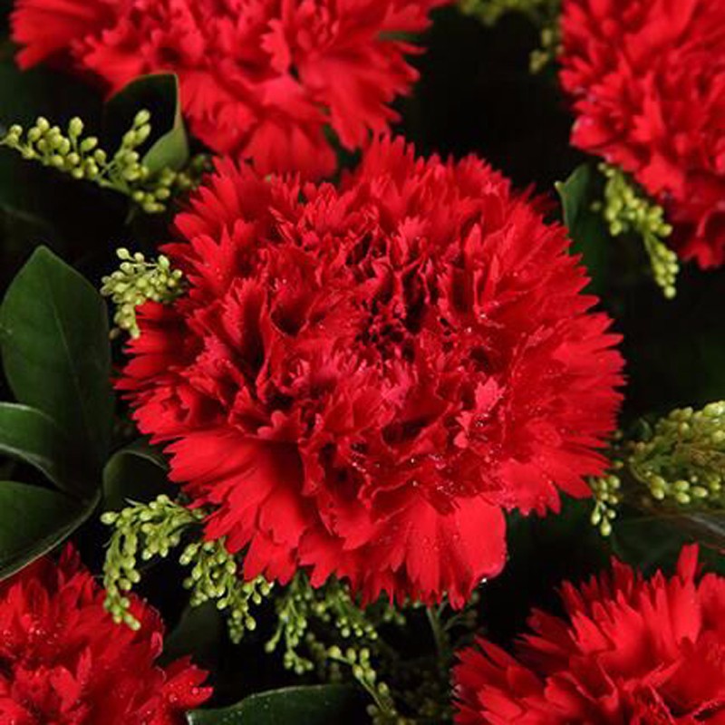 花 材:11支红色康乃馨,搭配适量栀子叶、黄莺。