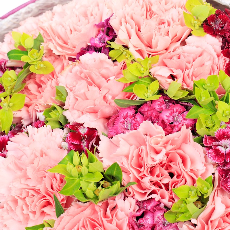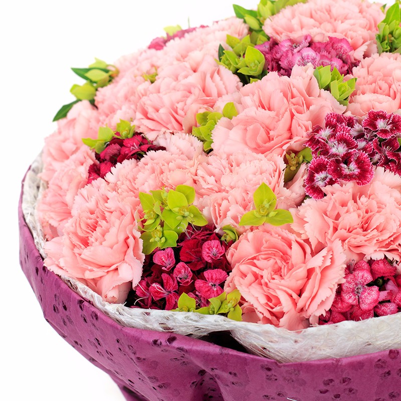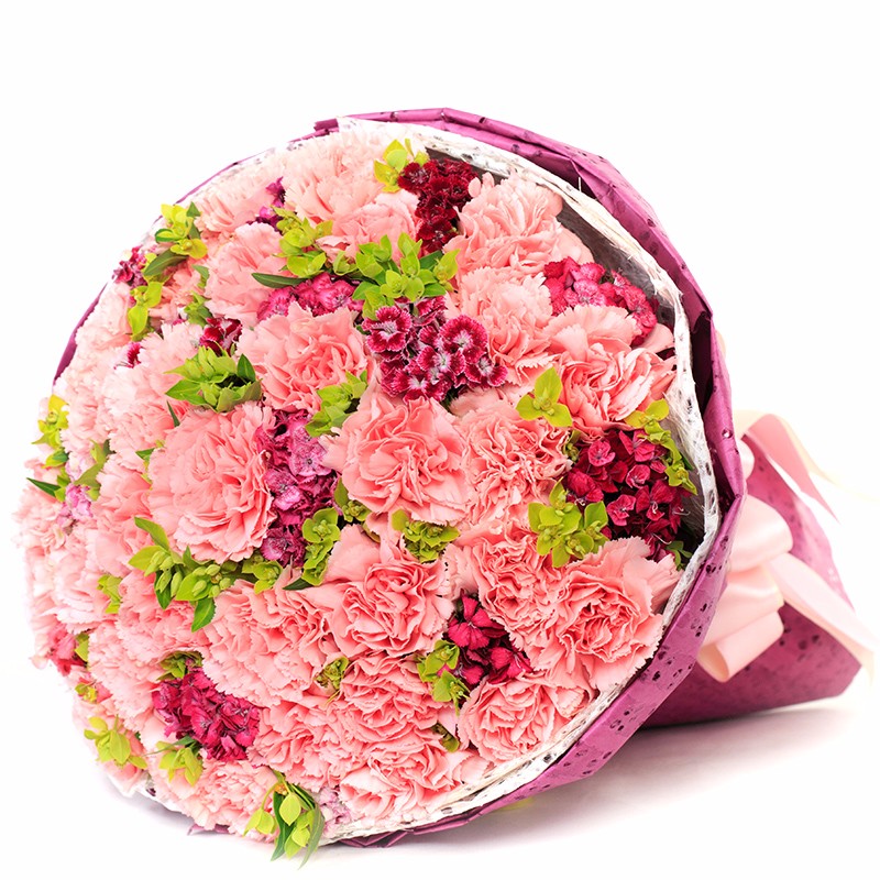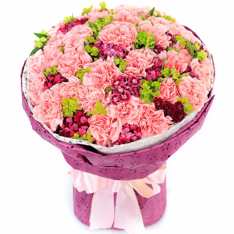 花 材:33支粉色康乃馨,搭配适量长寿花、石竹