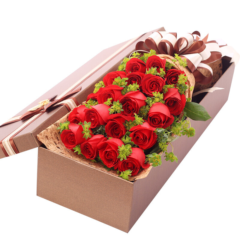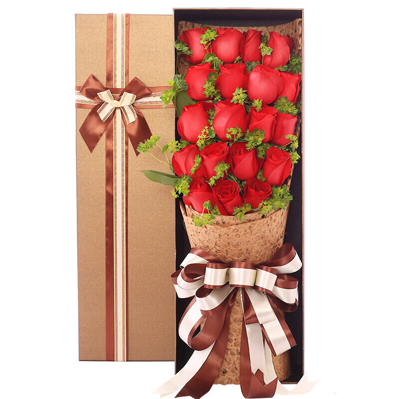 花材: 19支精品红玫瑰,搭配叶上黄莺点缀。