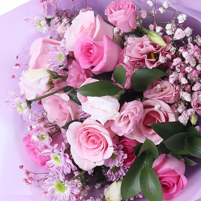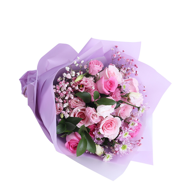 花材: 11支精品粉玫瑰,搭配适量粉色桔梗。粉色满天星、浅紫色小野菊、绿叶。