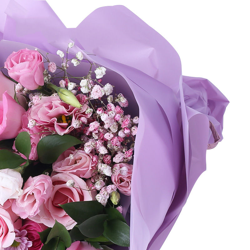 花 材:11支精品粉玫瑰,搭配适量粉色桔梗。粉色满天星、浅紫色小野菊、绿叶。