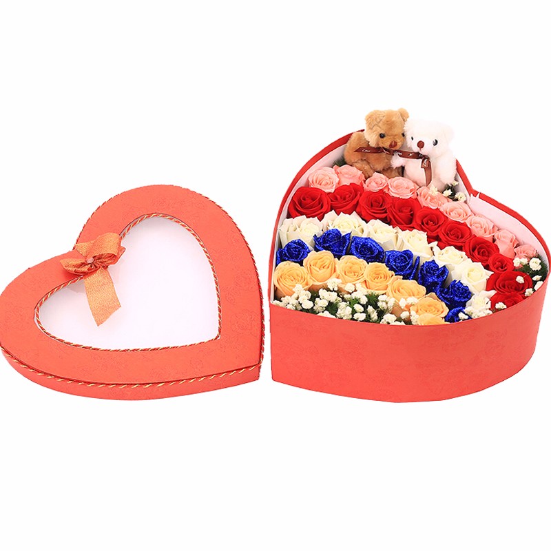 花材: 40朵精品混色玫瑰(粉玫瑰、红玫瑰、白玫瑰、蓝色妖姬、香槟玫瑰)依次围边造型,2只可爱小熊,搭配白色满天星、天冬门装饰。