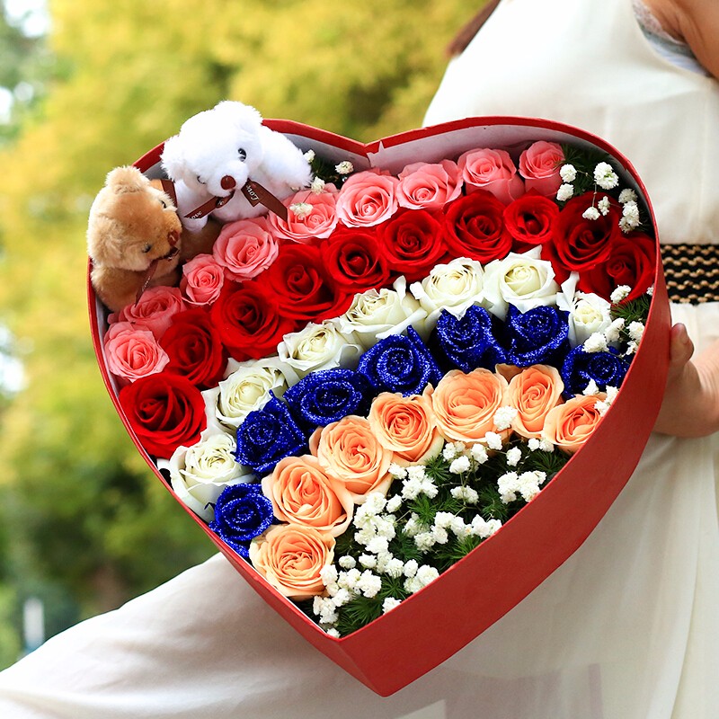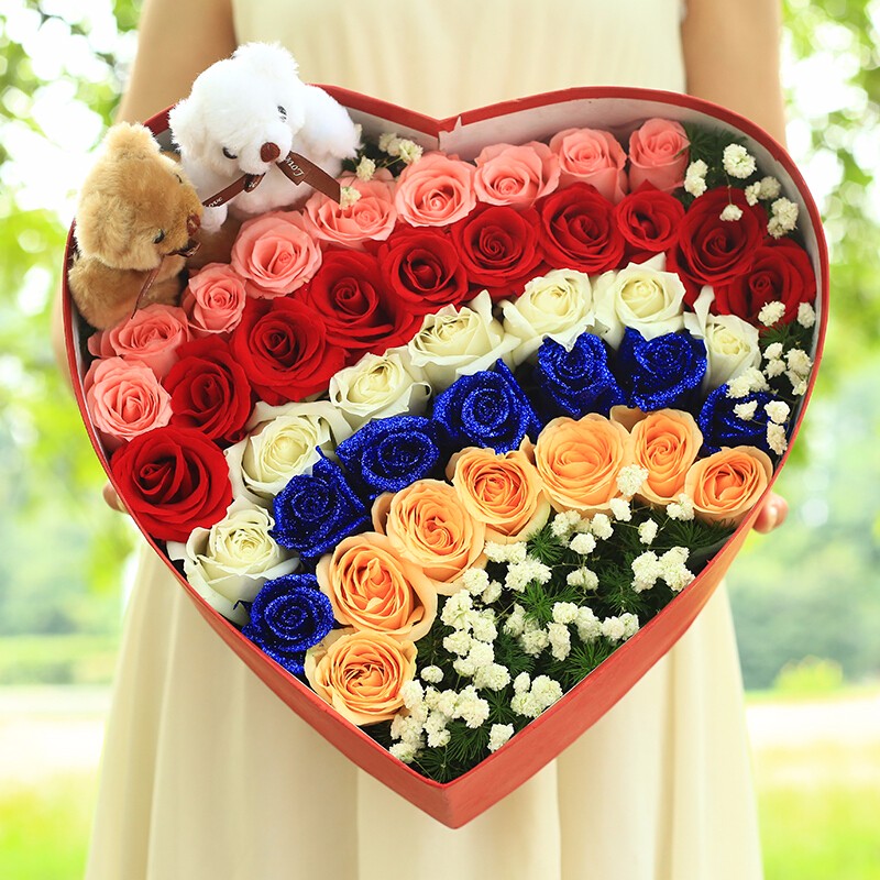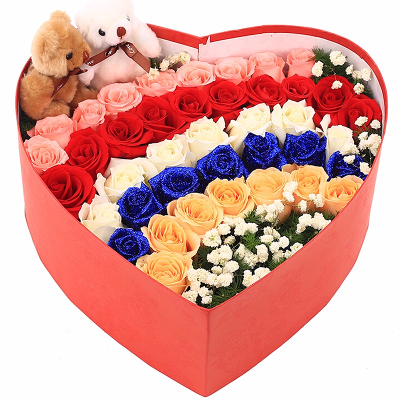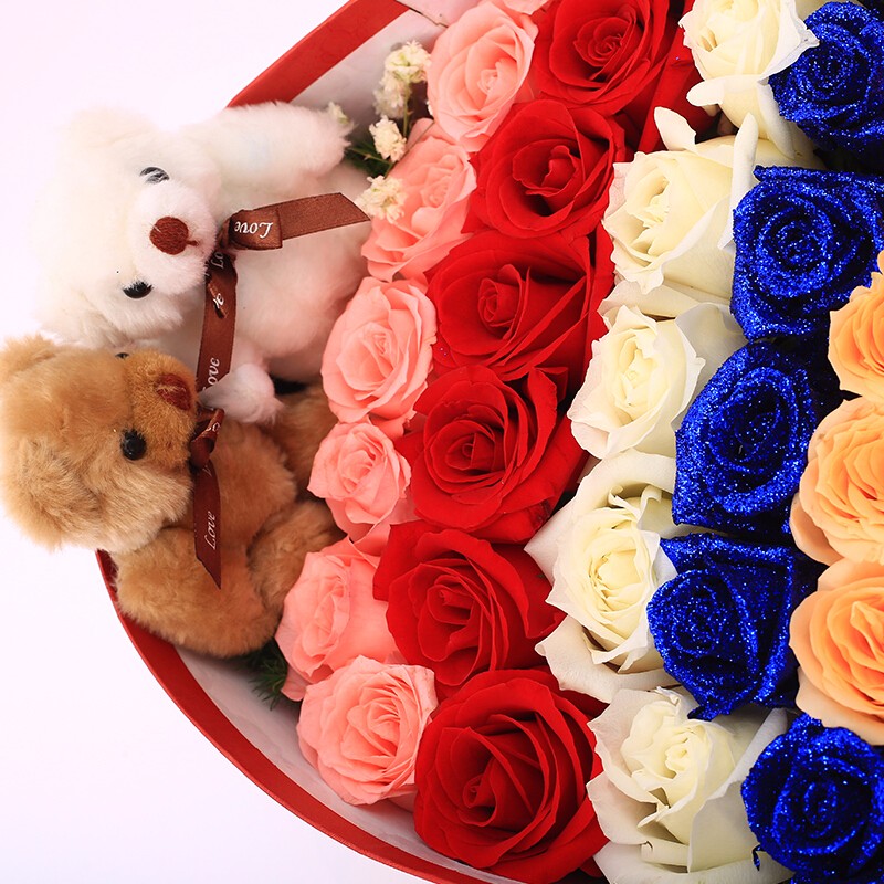 花 材:40朵精品混色玫瑰(粉玫瑰、红玫瑰、白玫瑰、蓝色妖姬、香槟玫瑰)依次围边造型,2只可爱小熊,搭配白色满天星、天冬门装饰。