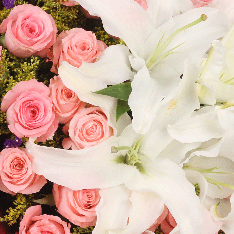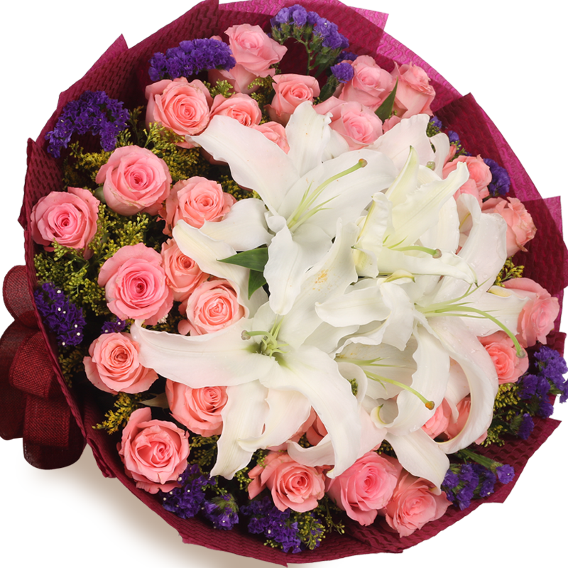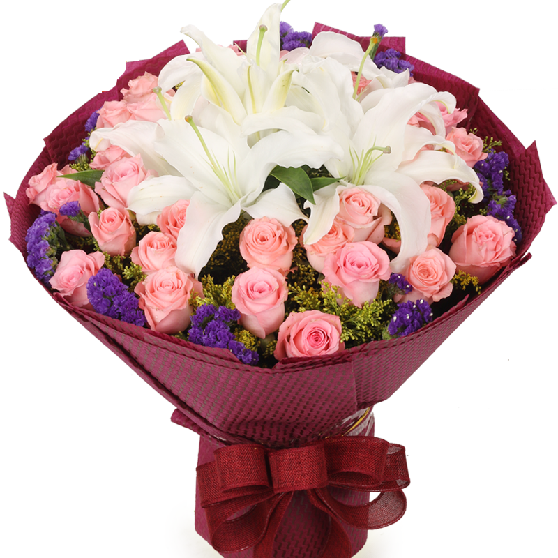 花材: 精选33朵粉玫瑰,6朵香水百合,搭配黄莺、勿忘我间插点缀。