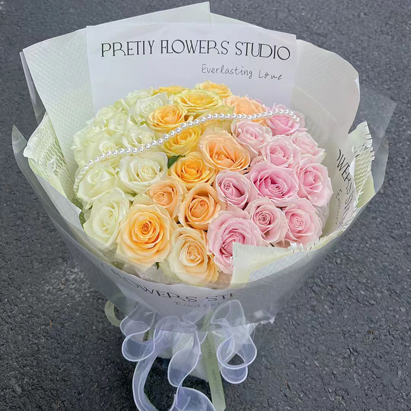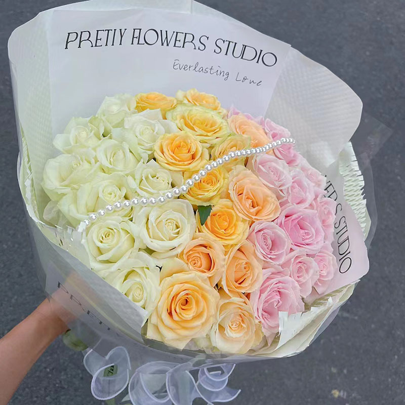 花材: 33朵渐变色玫瑰(白色、香槟色、粉色),搭配1条珠串。