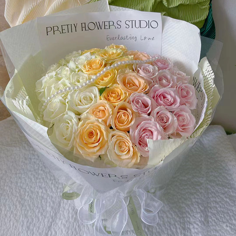 花 材:33朵渐变色玫瑰(白色、香槟色、粉色),搭配1条珠串。