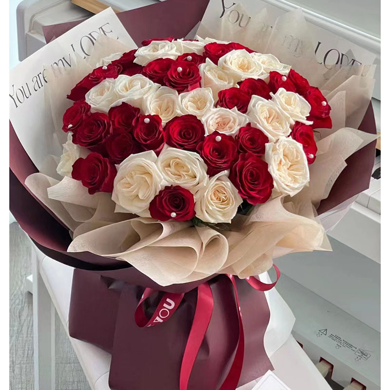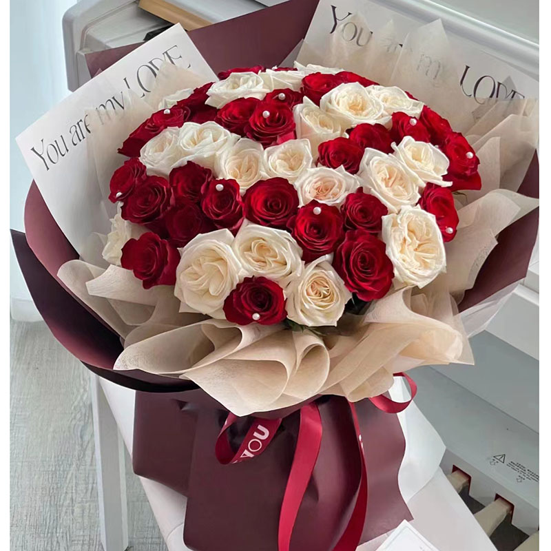 花材: 52朵红玫瑰白荔枝玫瑰混搭(30朵红玫瑰,22朵白荔枝玫瑰),搭配小珍珠装饰花面。