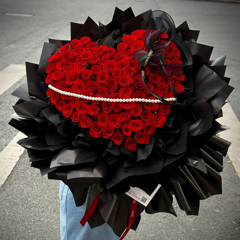 花 材:99朵红玫瑰心形造型,1条珠串,1朵黑色缎带蝴蝶结装饰花面。