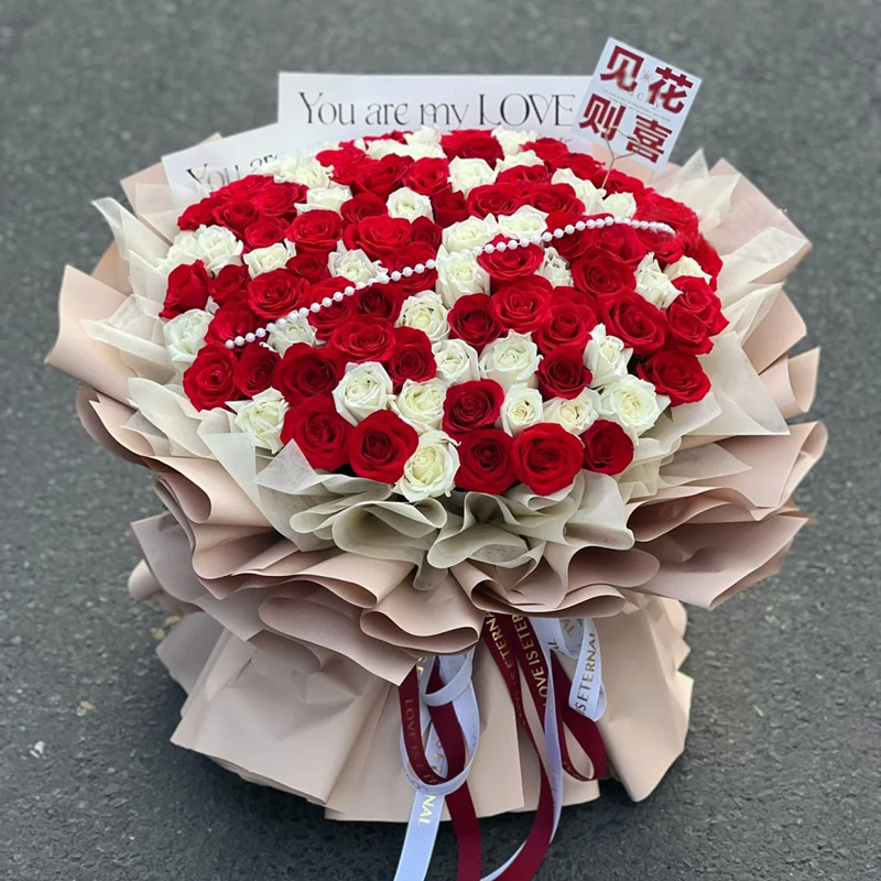 花 材:精选红玫瑰,白玫瑰共99朵,珠串装饰花面。