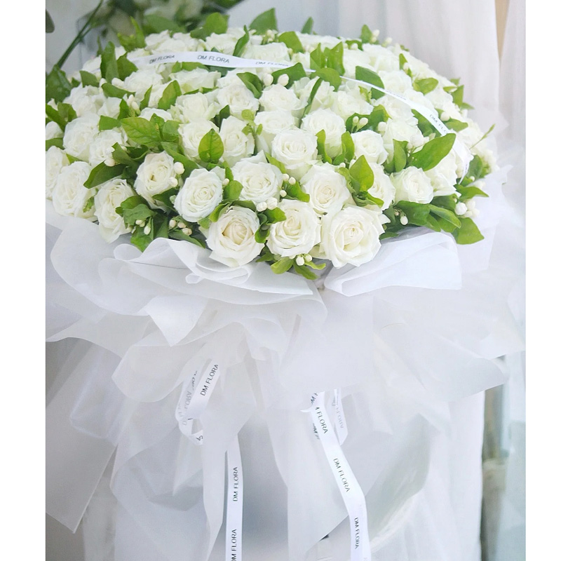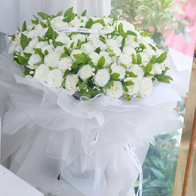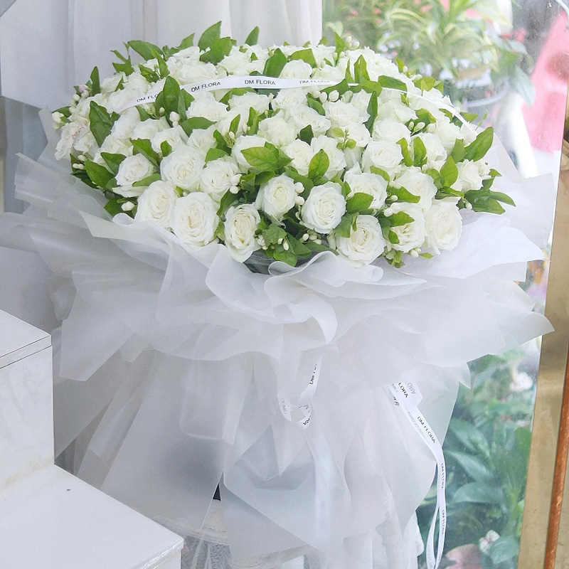 花材: 99朵白玫瑰松散包装,茉莉花丰满间插装饰(若茉莉花不当季断货,则用尤加利叶、栀子叶搭配白色满天星或者洋桔梗装饰)