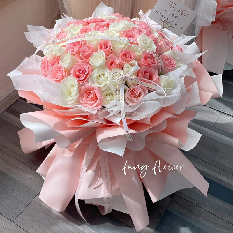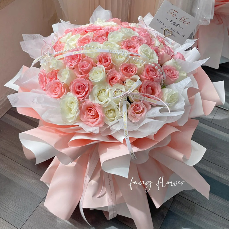 花 材:99朵玫瑰混搭(白玫瑰、粉玫瑰占一半),1条珠串,3只蝴蝶结、1条白色缎带装饰花面。