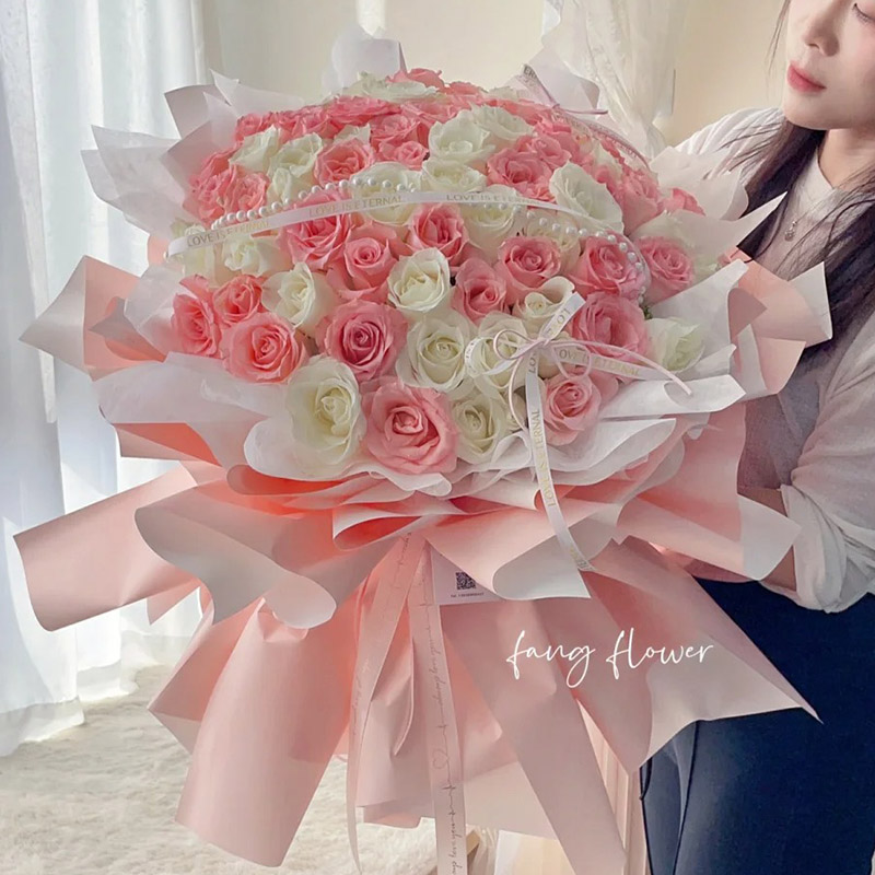 花材: 99朵玫瑰混搭(白玫瑰、粉玫瑰占一半),1条珠串,3只蝴蝶结、1条白色缎带装饰花面。