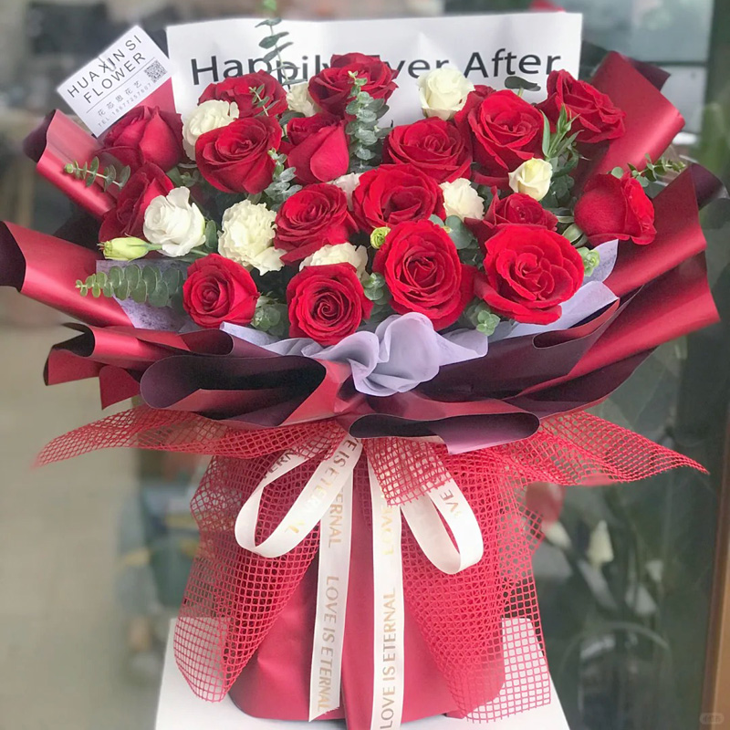 花材: 19朵红玫瑰,5支洋桔梗(断货则用5朵白玫瑰代替),尤加利叶间插。