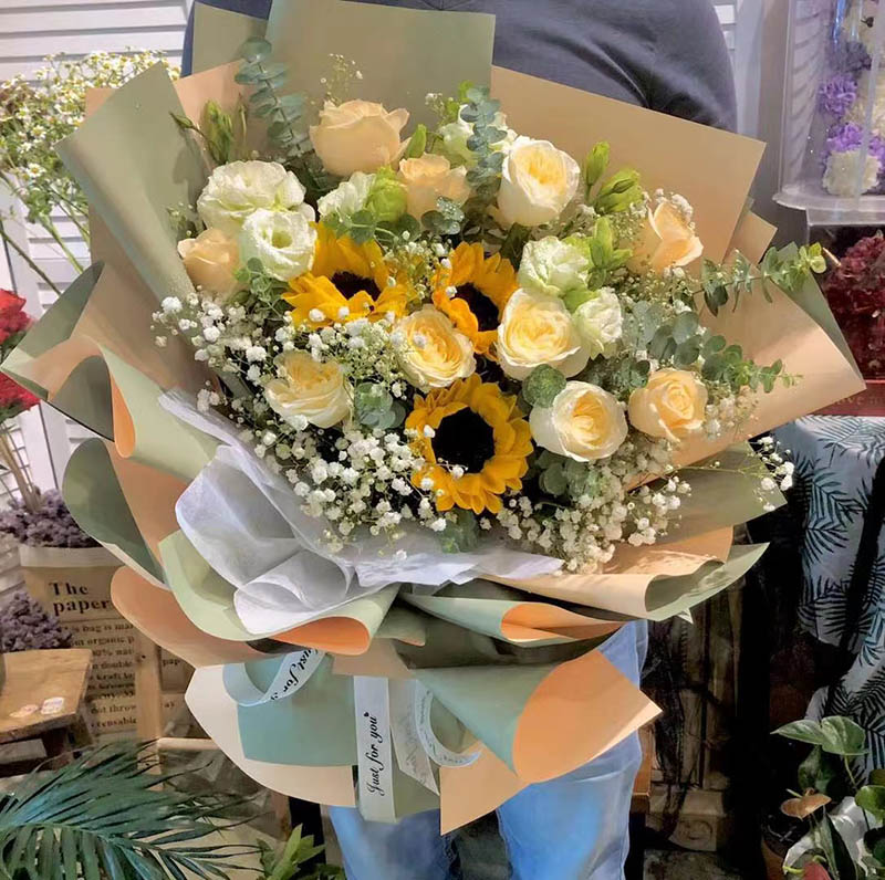 花 材:3支向日葵,8朵香槟色玫瑰,搭配3支白色洋桔梗(断货则用3朵白玫瑰代替),尤加利叶、满天星装饰。