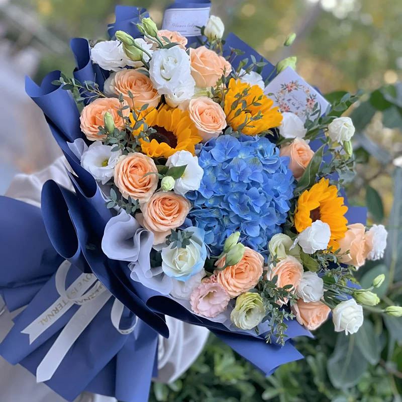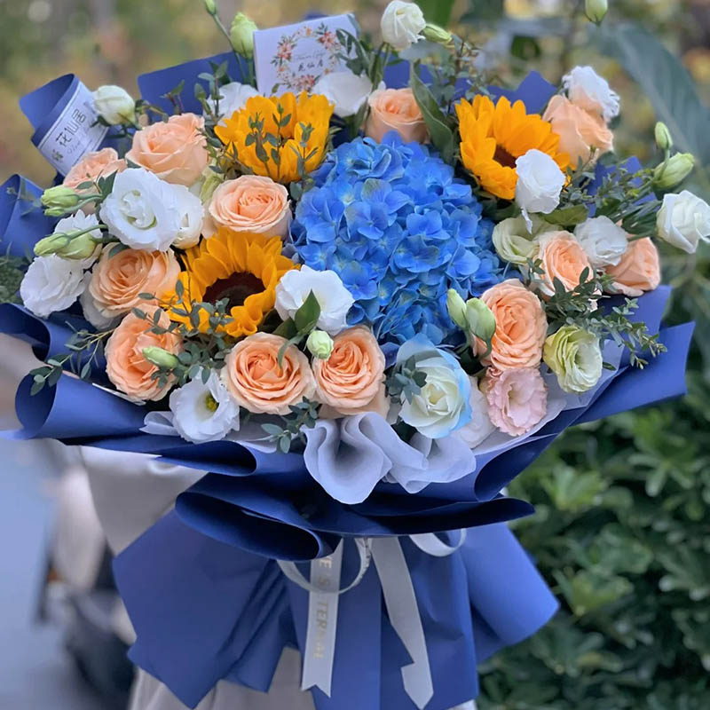 花材: 1支蓝色绣球,3支向日葵,11朵香槟色玫瑰,搭配8支洋桔梗(断货则用8支白玫瑰或者橙色多头小玫瑰代替),尤加利叶间插装饰。