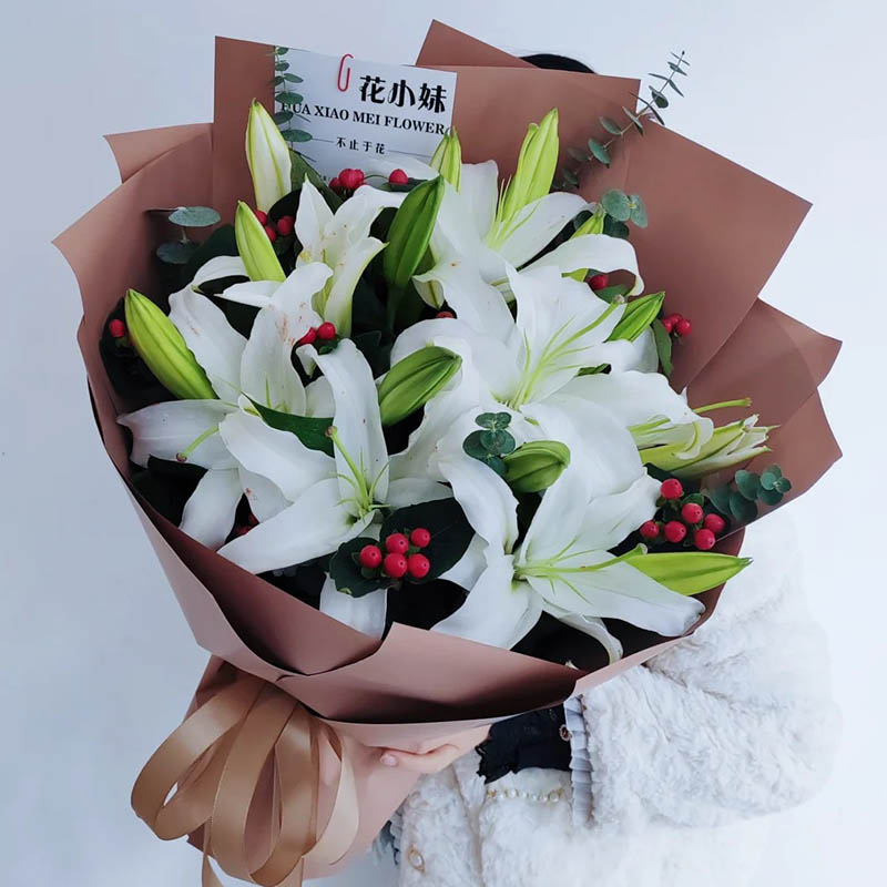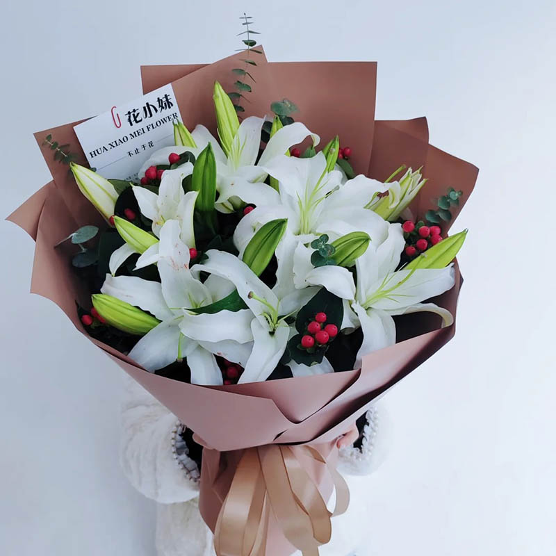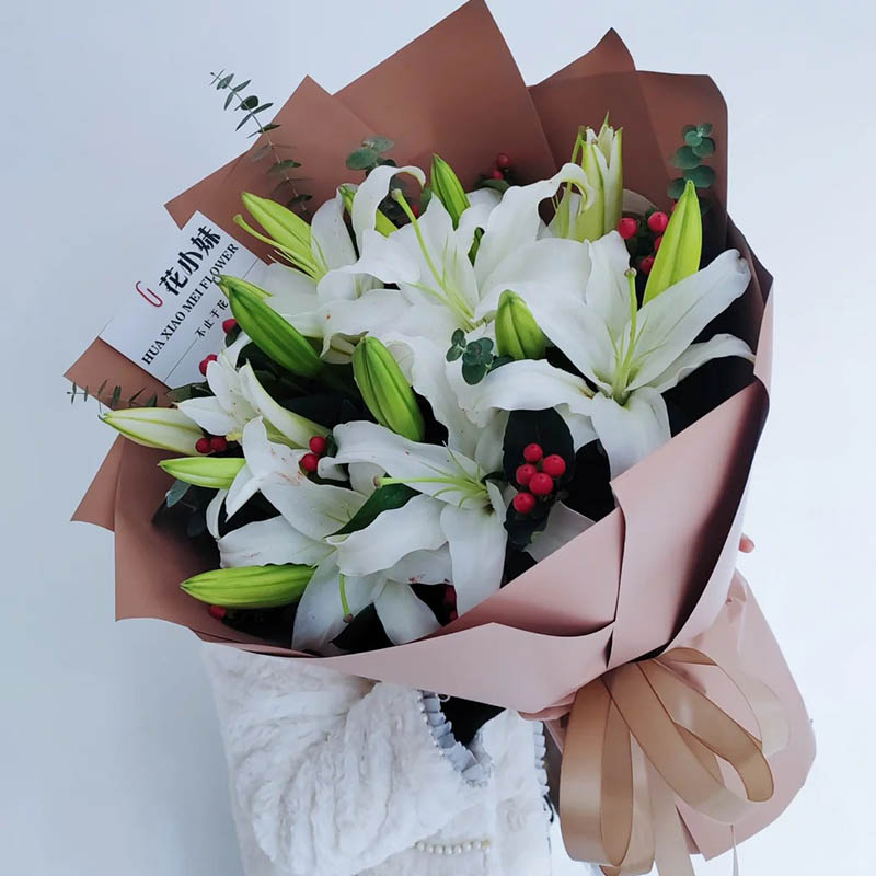 花 材:5支多头白色香水百合,搭配红豆、尤加利叶装饰。