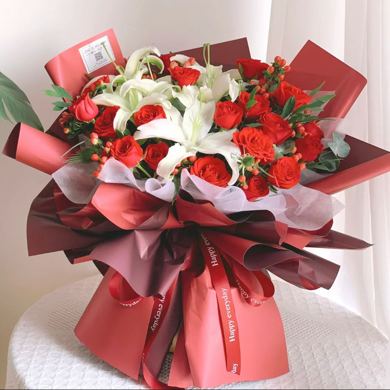 花 材:19朵红玫瑰,2支白色多头香水百合,搭配红豆、尤加利叶装饰。