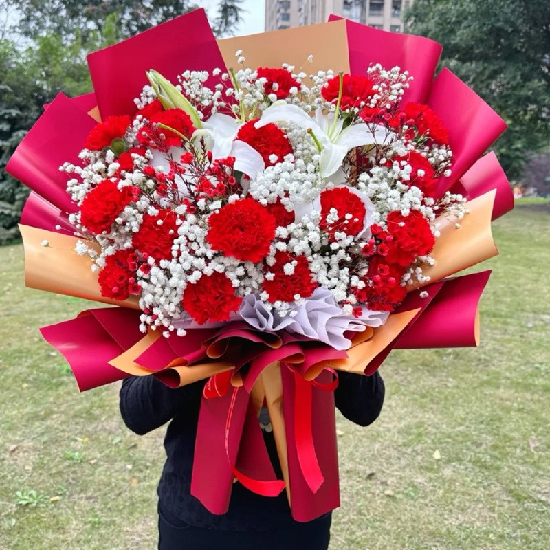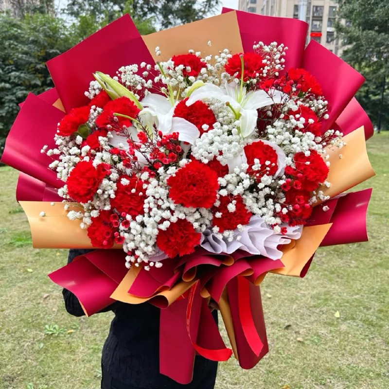 花 材:19朵红色康乃馨,1支白色多头香水百合 ,搭配满天星装饰。