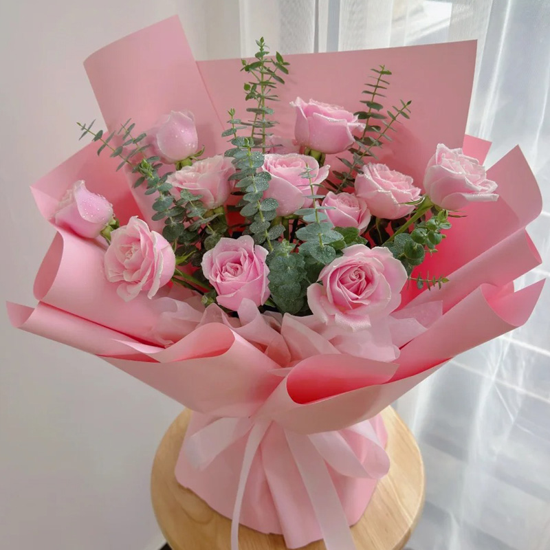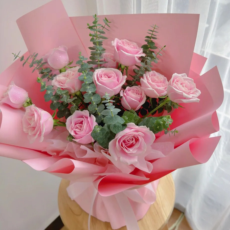 花材: 11朵粉玫瑰,尤加利叶装饰。