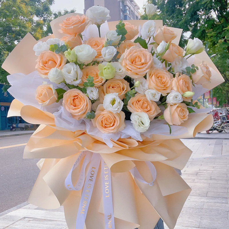 花材: 19支香槟玫瑰,搭配10支白色洋桔梗(断货则用12支白玫瑰代替),尤加利叶装饰。