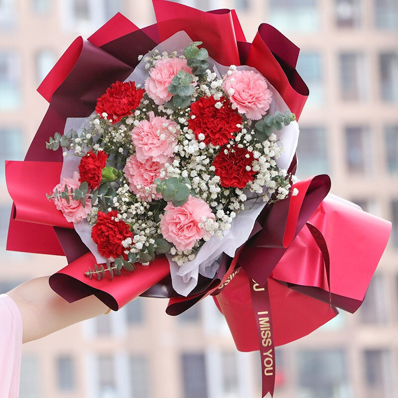 花 材:11朵康乃馨混搭(红色5朵,粉色6朵),白色满天星间插,尤加利点缀。