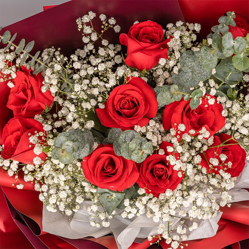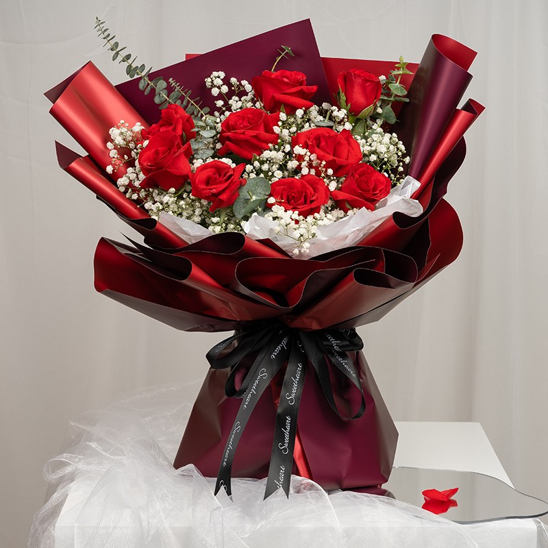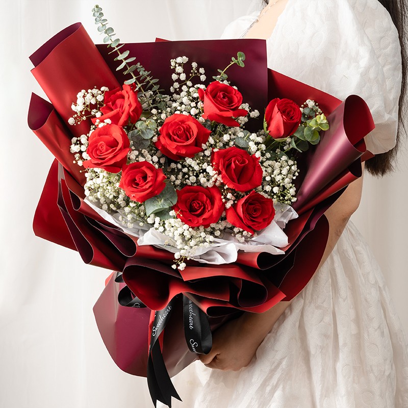 花 材:精选9支红玫瑰,搭配满天星、尤加利叶丰满间插。