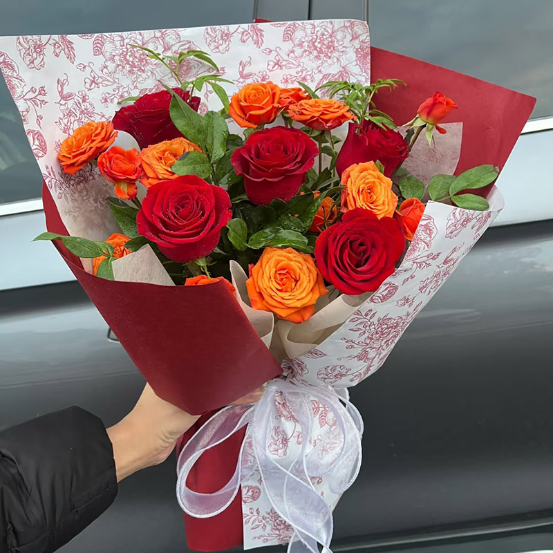 花 材:5朵红玫瑰,搭配4支橙色泡泡,绿叶装饰。