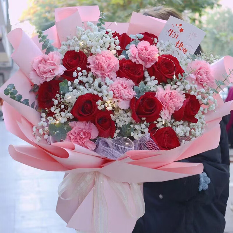 花材: 19朵红玫瑰、粉色康乃馨混搭(11朵红玫瑰、8朵粉色康乃馨),1条灯带,搭配满天星、尤加利叶装饰。